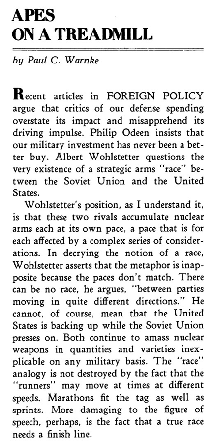 Of all the rebuttals to Wohlstetter that the magazine published, one stands out for its approach and imagery. Paul C. Warnke, a former defense official in the administration of President Lyndon Johnson and a staunch arms controller, did not challenge Wohlstetter’s scholarship or conclusions. He argued that the entire premise of his article was wrong: vying for advantage in the nuclear arms competition was a senseless exercise. He likened the United States and Soviet Union to two “apes on a treadmill,” accumulating more and more nuclear weapons in the futile pursuit of nuclear superiority. In Warnke’s opinion, the arms competition resembled less a race in which the two rivals were running at different paces and in different directions. They were instead “jogging in tandem on a treadmill to nowhere.”2
